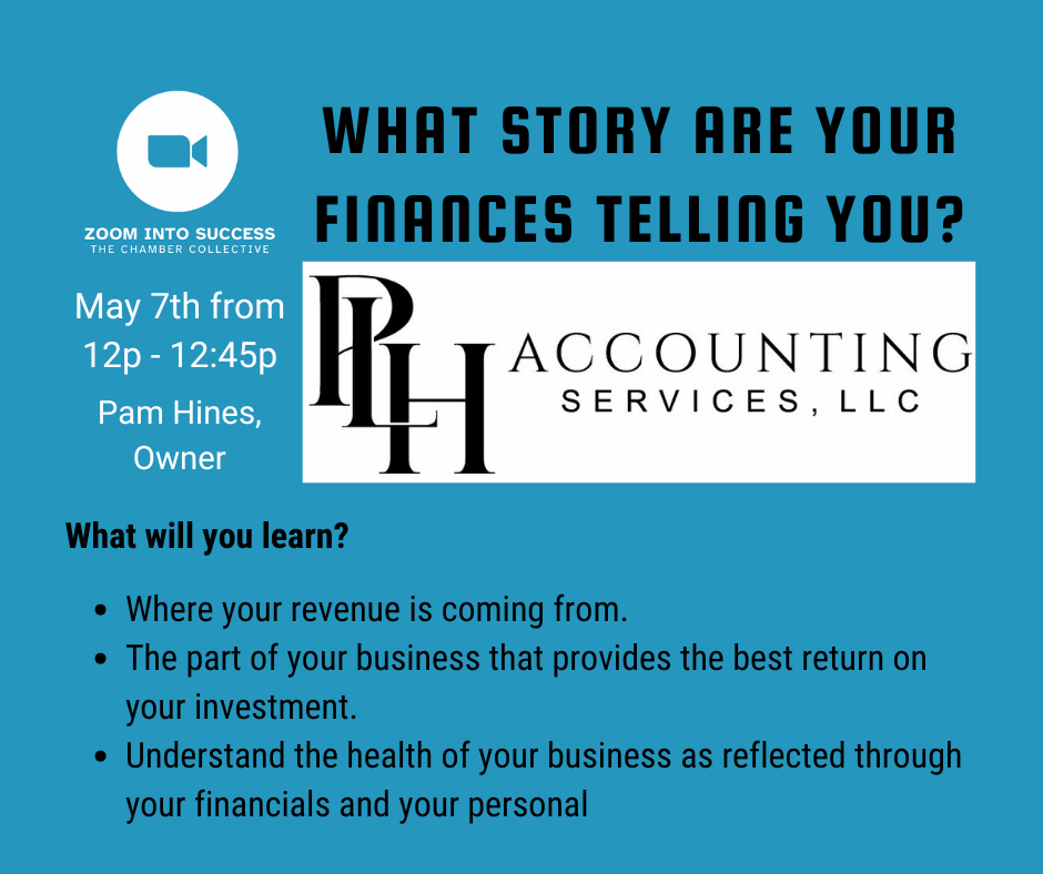 Engage, Connect, and Grow with Zoom Into Success, a tailored business development series crafted for small businesses. This virtual event places a spotlight on vital pillars: Business Finance, Marketing, Employee Retention, and Business Development. Whether you're launching a startup or scaling your existing business, Zoom Into Success is your gateway to engaging insights, meaningful connections, and sustainable growth in the competitive business landscape. This Session From understanding the difference between your Tax Story and your Cash Flow Story, to assessing the true health of your business, this session will empower you to decode your financial data and make smarter, more strategic decisions. Perfect for small business owners, entrepreneurs, and managers looking to gain clarity and confidence in their numbers. Presenter: Pam Hines with PLH Accounting Services, LLC *** Recording Notice: This online event will be recorded and posted to websites like Youtube for future viewing. Attendees may elect not to turn on their camera. Members can attend the the Zoom Into Success Business Development Series for FREE! Non-Members can attend for a small fee of just $25.